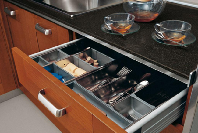 Telescopic channels and tandem channels are commonly used in modular kitchen. Apart from above a wide range is available like inner drawer, glass side drawer, etc. You can choose various dividers and accessories to be placed inside drawer for cutlery, bottles, spice bottles, etc.